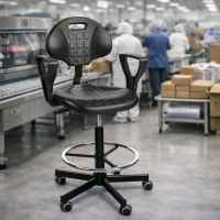Krzesło przemysłowe z pianki integralnej o bardzo wysokiej odporności na zanieczyszczenia chemiczne. Znajduje zastosowanie w warsztatach, zakładach produkcyjnych o dużym zanieczyszczeniu chemicznym (oleje, smary, woda, itp). Wersja na kółkach z podnóżkiem RING i podłokietnikiem. Wykończenie: pianka integralna
