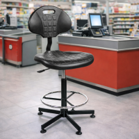 Krzesło przemysłowe z pianki integralnej o bardzo wysokiej odporności na zanieczyszczenia chemiczne. Znajduje zastosowanie w warsztatach, zakładach produkcyjnych o dużym zanieczyszczeniu chemicznym (oleje, smary, woda, itp). Wersja na stopkach z podnóżkiem RING. Wykończenie: pianka integralna
